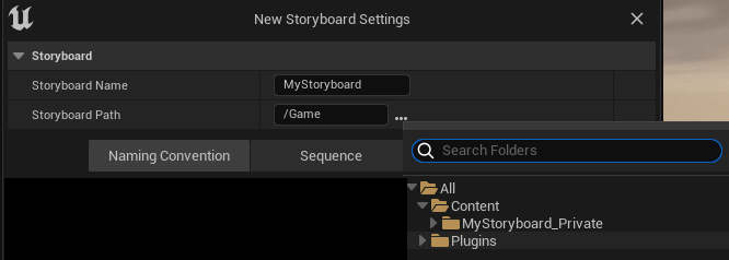 So far, we just advise you to give your storyboard a name and select its path into the Content Browser, before clicking on the blue button Create Storyboard.
