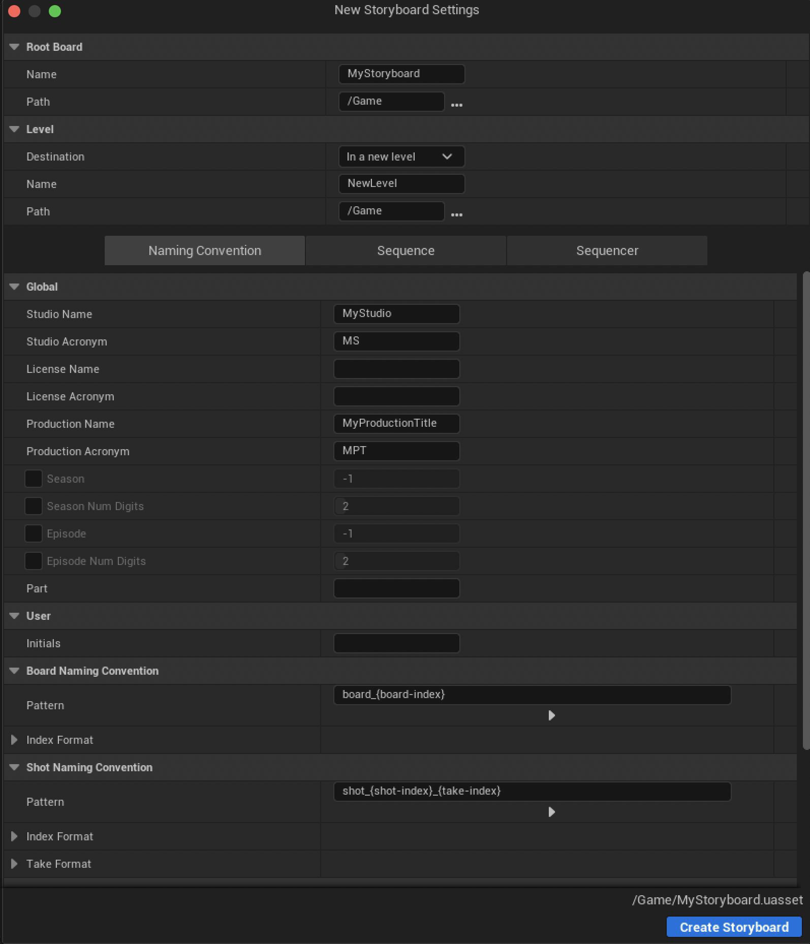 name and create (if necessary) the Level that will be used by the Board Sequence to create Cine Camera Actors and Animation Actors.