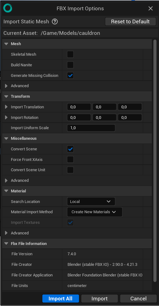 Unreal Engine will give you some import options for the .fbx file. Before importing, you can change the model’s Import Uniform Scale to uniformly scale up the model for example.