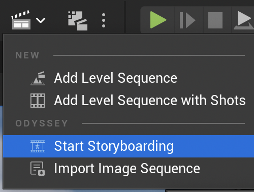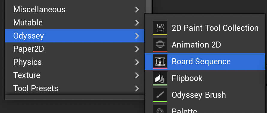 You can create a Board Sequence with a right click on the Content Browser and select “Odyssey” ▸ “Board Sequence” in the pop-up window.